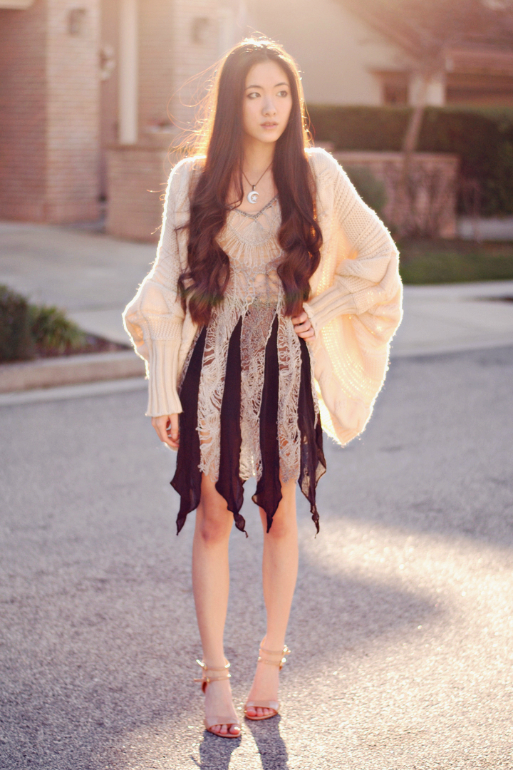 Chunky Batwing Cardigan c/o Romwe, Moon & Star Pendant from eBay, Shredded Spiderweb Dress c/o Urban 1972, Nude Ankle-Strap Pumps from Nine West